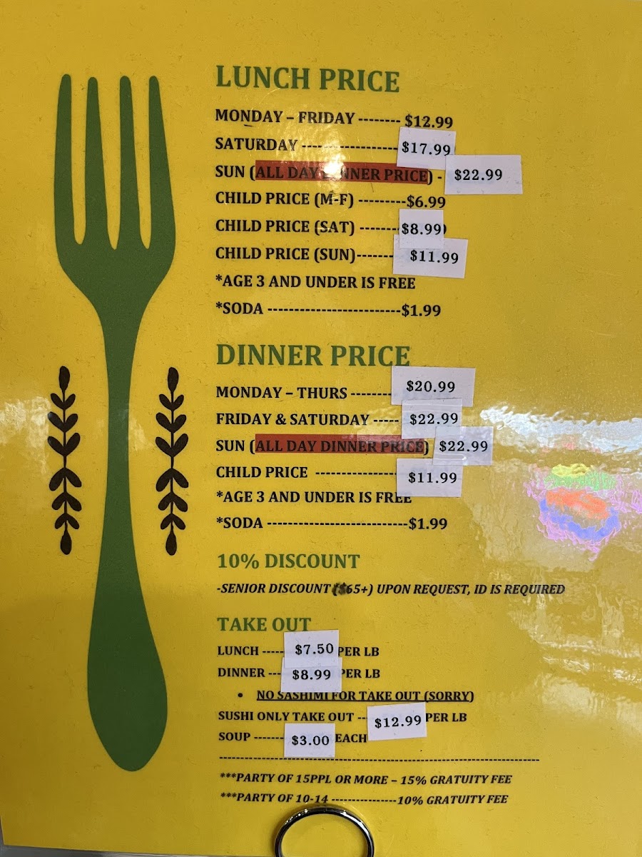 The menu is suitable for casual dining occasions, whether ordering individual hibachi plates and signature rolls or opting for the buffet experience. It provides a range of hot and cold dishes, catering to those who prefer à la carte items as well as those seeking an all-you-can-eat meal.